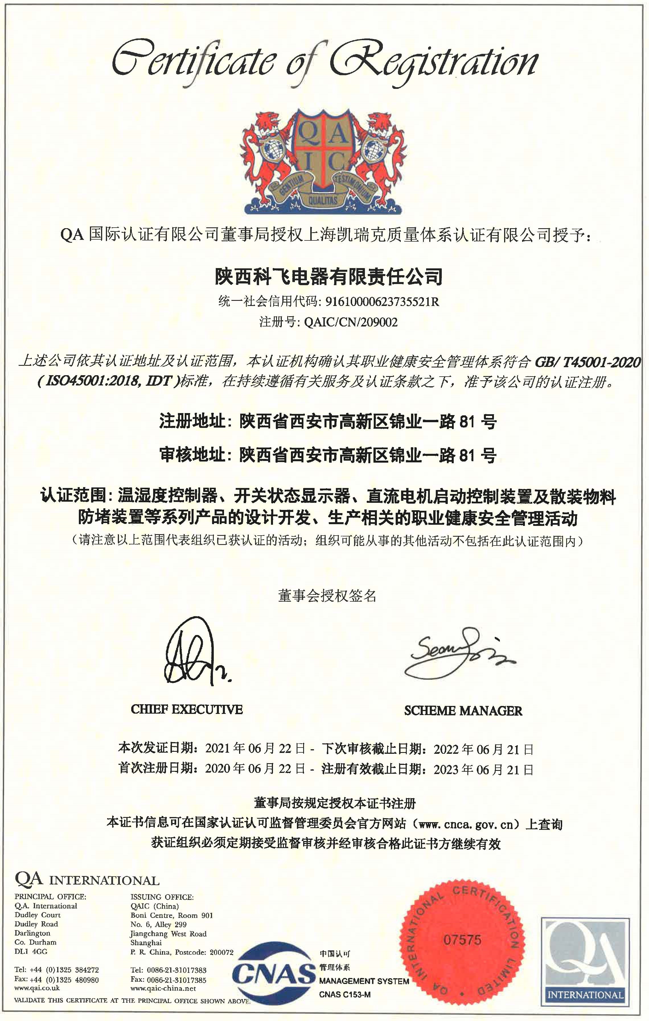 此次审核,审核组依据监审体系文件和标准要求,依次对我司人力资源管理情况、公司资源配置、生产运行过程、对供货方的评价选择和对采购产品的验证、环境管理指标、职业健康安全方针等多个方面进行了检查,最终,专家组一致认定,我司质量环境职业健康安全管理体系文件符合要求,绩效运行良好,顺利通过《职业健康安全管理体系GB/T45001-2020标准(ISO045001:2018,IDT)》认证监督审核,此次认证范围包括温湿度控制器、开关状态显示器、直流电机启动控制装置及散装物料、防堵装置等系列产品的设计开发、生产相关的职业健康安全管理活动。