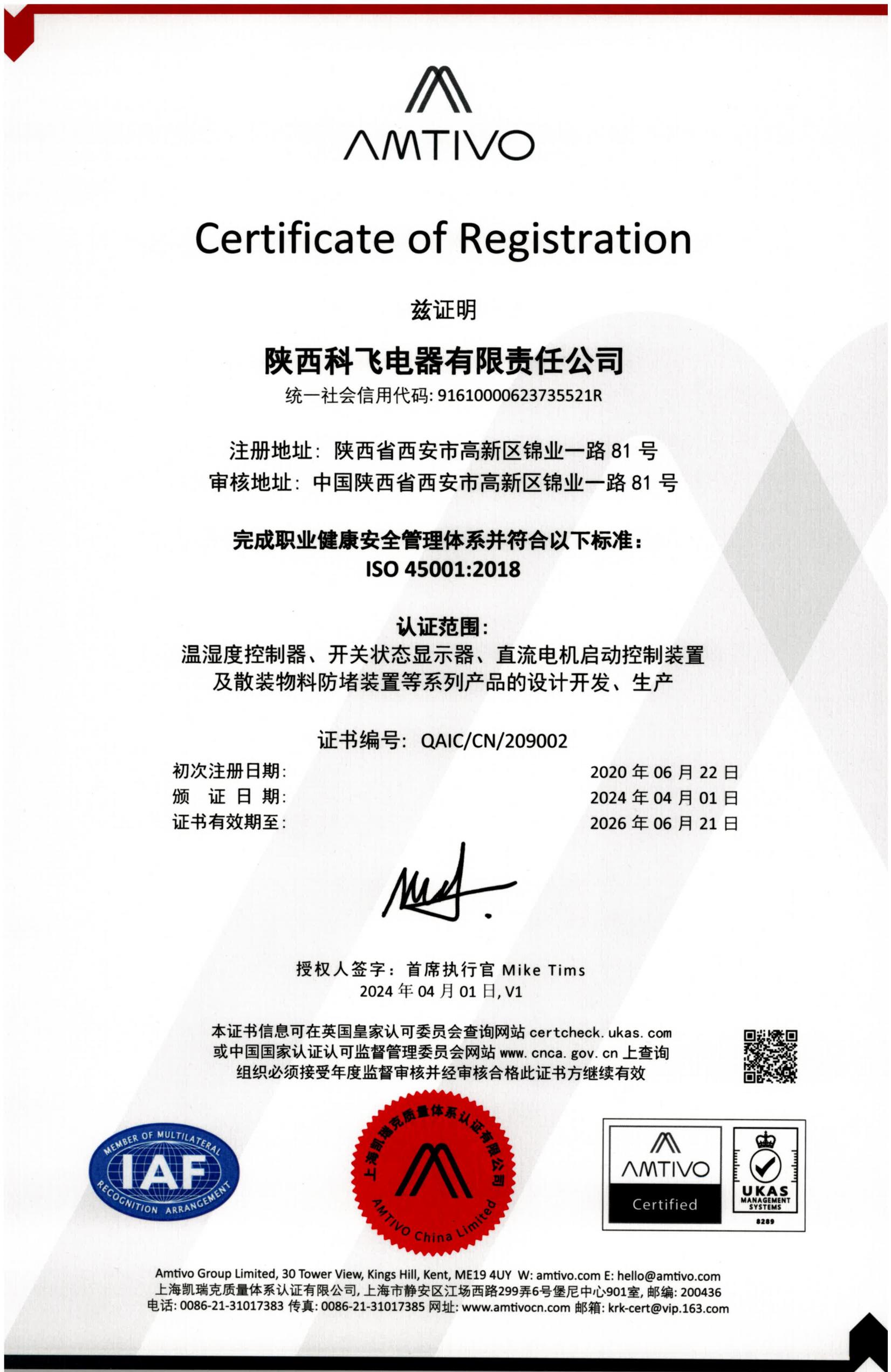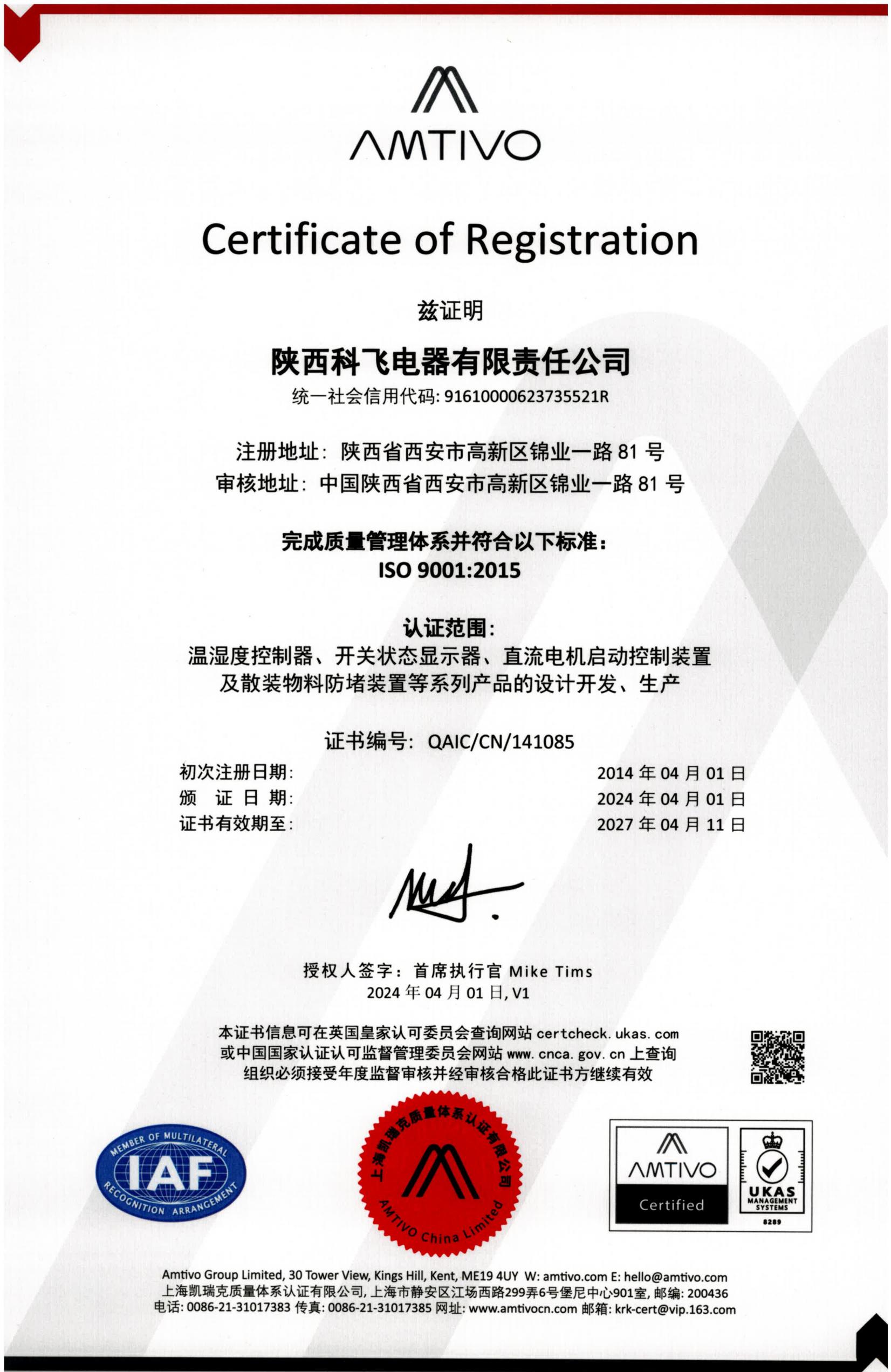 经审核,审核专家组对公司在质量管理方面取得有成绩给予了充分肯定,从抽查现场生产情况来看,部门员工生产技术扎实、程序规范,工程合格率高,得到客户的一致认可,符合“重合同、守信用”企业,符合管理体系新版标准要求。此次认证范围为温湿度控制器、开关状态显示器、直流电机启动控制装置及散装物料防堵装置等系列产品的设计开发、生产。
